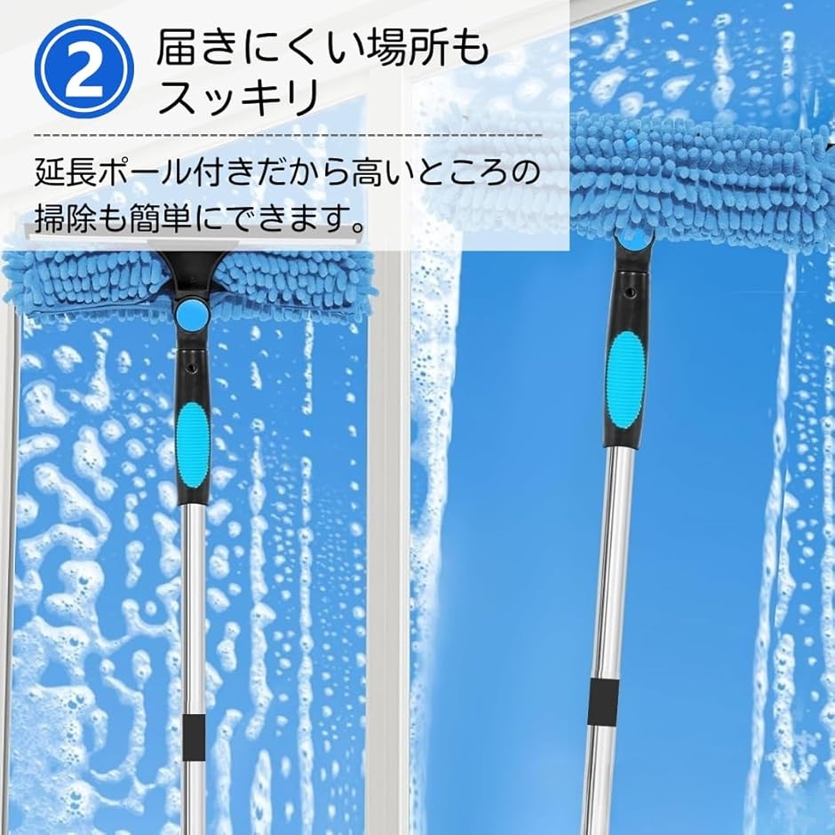 「掃除する場所に合わせて長さ調節可能」天井や高い壁、屋外のガラス、窓の掃除に最適で、手持ちの水切りワイパーとしても使えます。