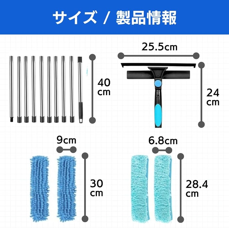 | 商品名 | 窓掃除 外壁掃除 ブラシ 高所掃除 窓ガラス 網戸 掃除 ワイパー 4m 長さ調節可能 掃除道具 水切りワイパー マイクロファイバー付き |