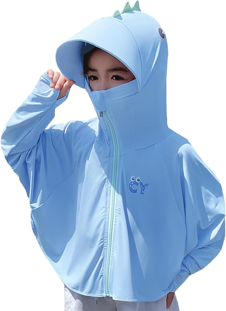 長袖、手の甲まで覆うサムホール仕様、子供に人気の大きな恐竜フード、マスクで可愛く暑さ対策。通園、通学にもおススメ。