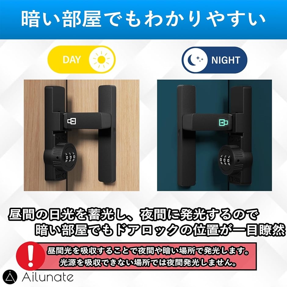 昼間の日光や蓄光することで夜間に発光し、暗い部屋でもドアロックの位置が確認できます。