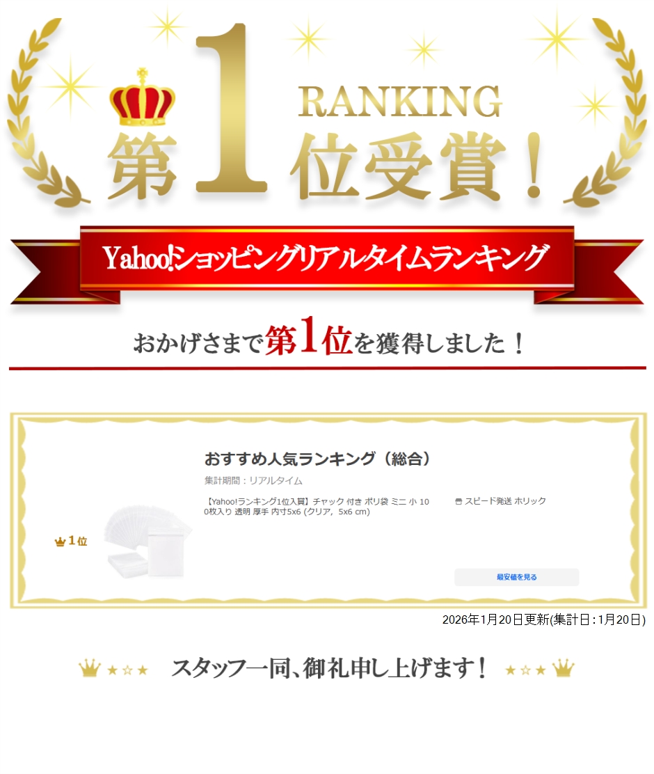 | 商品名 | チャック 付き ポリ袋 ミニ 小 100枚入り 透明 厚手 内寸5x6 CM 外寸5x7.3 CM 厚さ0.12mm |