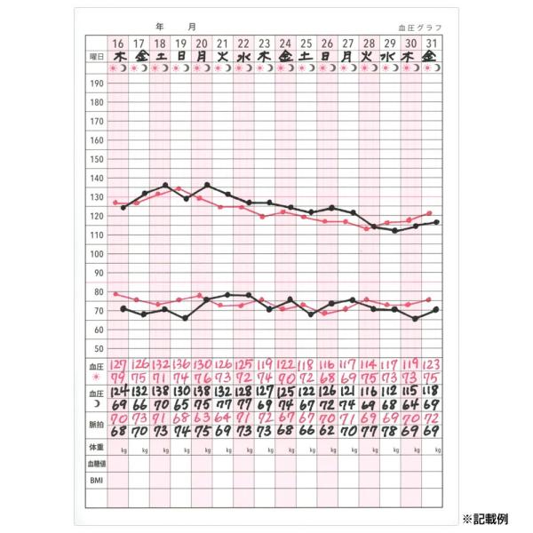 ◇記入項目:血圧折れ線グラフ、血圧数値(昼夜)、脈拍数値、血糖値、BMI、体重