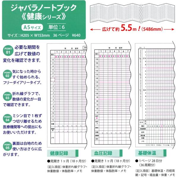 本文を広げて一覧できる、ジャバラノートブック健康シリーズのA5サイズダイアリーです。