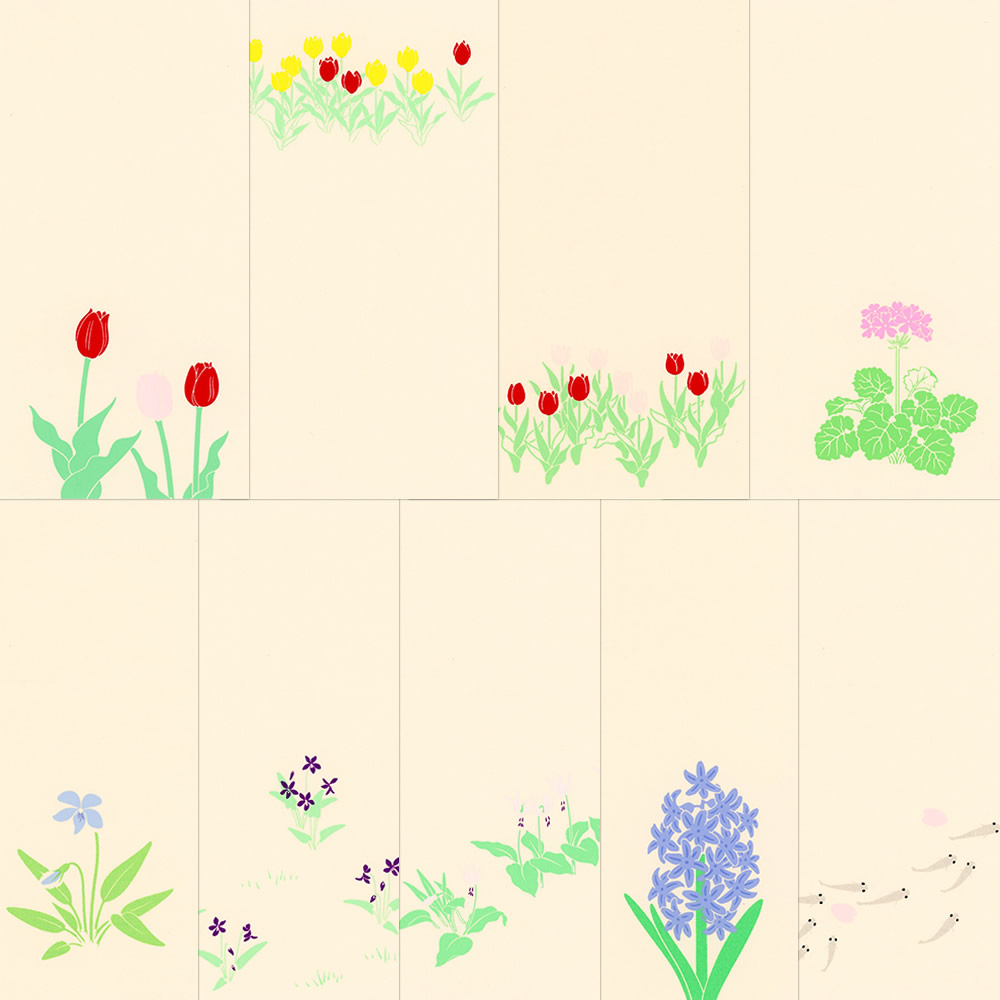◇絵柄(9柄):チューリップ×3柄、桜草、すみれ×2柄、かたくり、ヒヤシンス、めだか