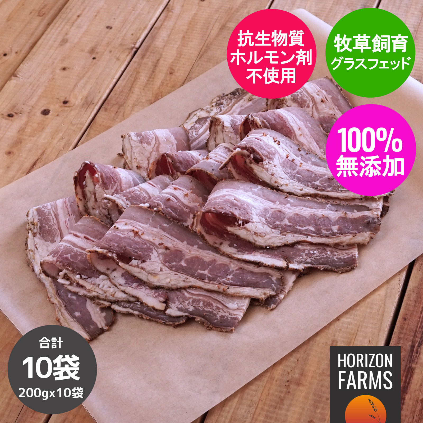 無添加・砂糖不使用 高品質 グラスフェッド 牛肉 パストラミ ビーフ ベーコンこちらは10パックセットです。お得な200gの単品商品と3パックセットもご用意がございます。市販されているビーフベーコンにおいて、この上なくクリーンかつ高品質なビーフベーコンをご用意しました。塩と100%天然のスパイスのみを使用し、10日間にわたり自然な製法で作られた、無塩せきベーコンです。硝酸塩、亜硝酸ナトリウム、キュアリングソルトなどの発色剤、セロリ、砂糖、保存料、着色料、人工的な原料、その他有害なものは一切不使用です。ヒッコリー材のスモーク・チップで2時間かけて、燻製にしています。さらに、こちらのベーコンはグルテンフリー、ラクトースフリーです。全ての過程においてこだわった結果、ご家族で安心してお召し上がりいただける、美味しいベーコンが出来上がりました。こちらのベーコンには、牛に成長促進ホルモン剤や抗生物質を投与することなく、牧草地にて通年放牧して育てている倫理的な牧場から仕入れた、グラスフェッドビーフの肩バラ部分を使用しています。工場での飼育は一切しておりません。