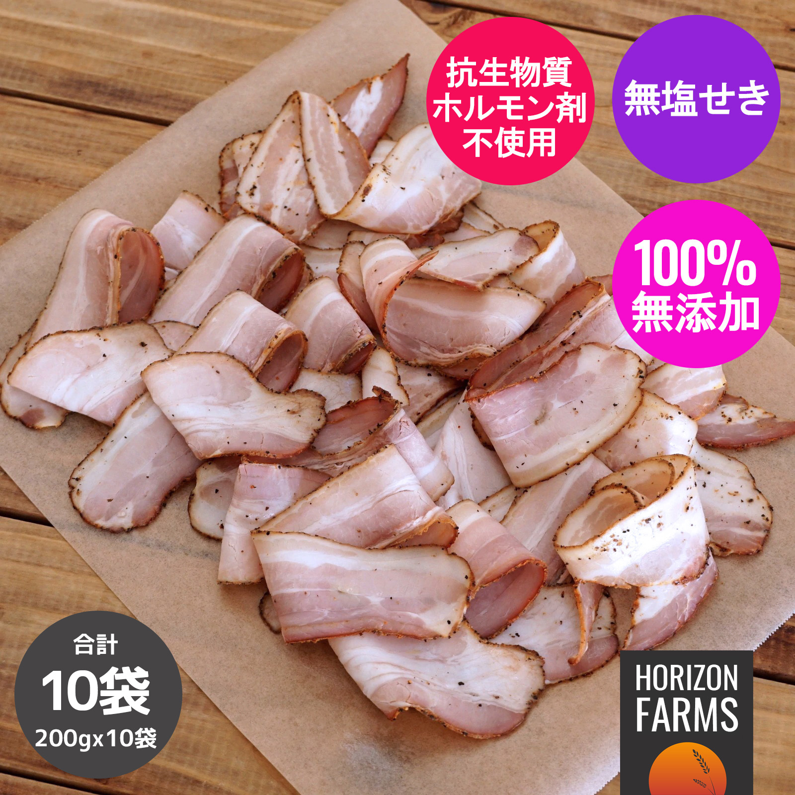 無添加・砂糖不使用 放牧豚 スモーク ベーコン スライス (2kg)こちらは10パックセットです。お得な200gの単品商品と3パックセットもご用意がございます。市販されているベーコンの中で、この上なくクリーンな高品質ベーコンをご用意しました。塩と100%天然のスパイスのみを使用し、10日間にわたり自然な製法で作られた、無塩せきベーコンです。硝酸塩、亜硝酸ナトリウム、キュアリングソルトなどの発色剤、セロリ、砂糖、保存料、着色料、人工的な原料、その他有害なものは一切不使用です。ヒッコリー材のスモーク・チップで2時間かけて、燻製にしています。さらに、こちらのベーコンはグルテンフリー、ラクトースフリーです。全ての過程においてこだわった結果、ご家族で安心してお召し上がりいただける、美味しいベーコンが出来上がりました。こちらのベーコンには、豚に成長促進ホルモン剤や抗生物質を投与することなく、放牧環境で育てている、倫理的な農場から仕入れた豚バラ肉のみを使用しています。工場での飼育は一切しておりません。