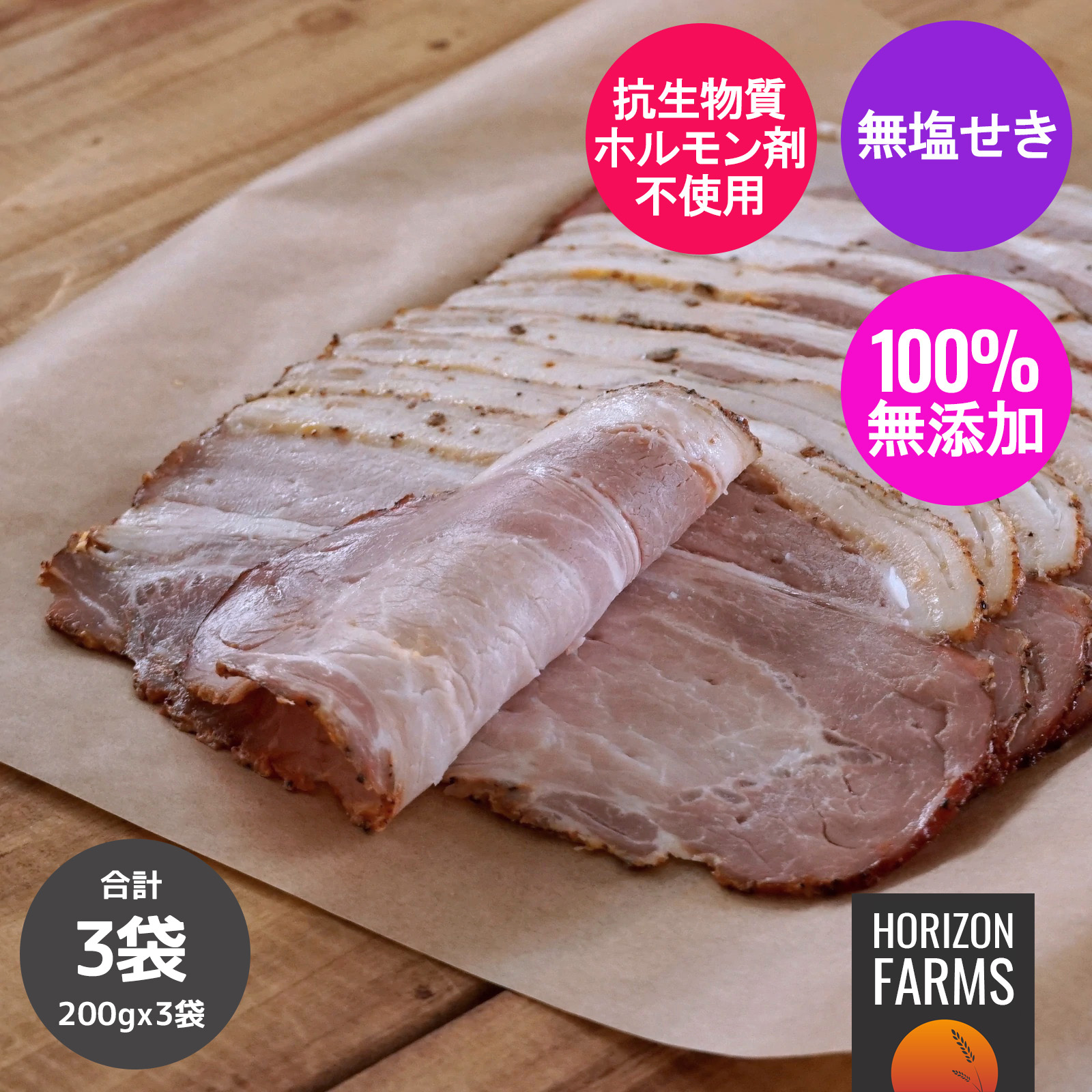 HORIZON FARMSでは様々な種類の無添加・無塩せきベーコンをご用意しております。画像をクリックしてページをご確認いただけます。