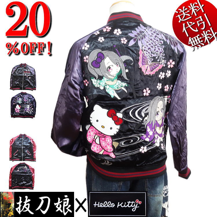 抜刀娘/バットウムスメ×Hello Kittyハローキティコラボ ほのかちゃん あおいちゃん&キティちゃん 総刺繍 ブルゾン/スカジャン 黒×袖パープル M/L/XL 221084