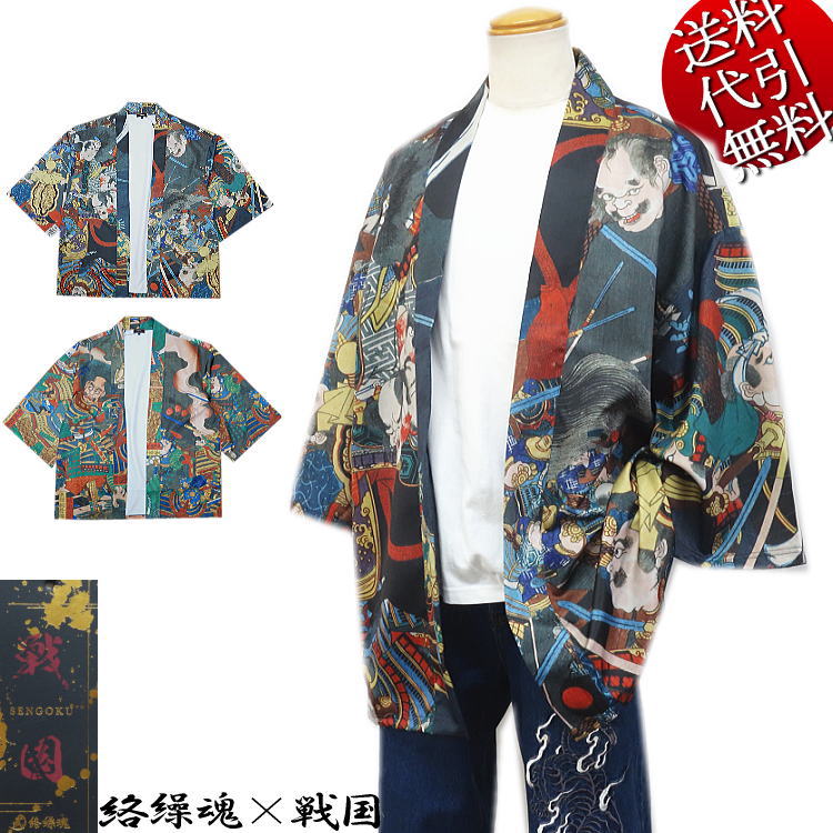 新作 春夏秋冬物 絡繰魂カラクリ魂/からくり魂 戦国SENGOKU 桶狭間の戦い 武将 浮世絵 ロゴ刺繍 七分 祭り カジュアル 羽織り 法被 黒:F/フリー(L〜4L) 261032
