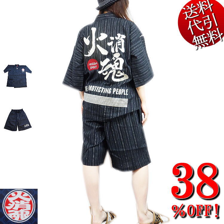 ビッグ有 火消魂 HIKESHI SPIRIT ロゴ刺繍 ストライプ柄じしら織 和装半パンツ 和柄甚平 黒:XXL 727109