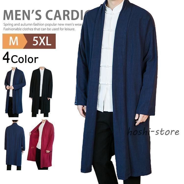 ロング丈 カーディガン メンズ スプリングコート コーディガン 綿麻 長袖 無地 薄手 羽織り カジュアル カーデ ゆったり ロングカーディガン トップス チャイナ