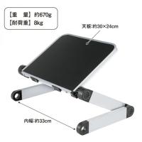 | サイズ | 折りたたみ時:約26×39.5×厚み4cm、天板平面使用時:約26×39.5×高さ9.5?26cm、天板サイズ:約30×24cm 個装サイズ:41.0×27.0×4.6cm |