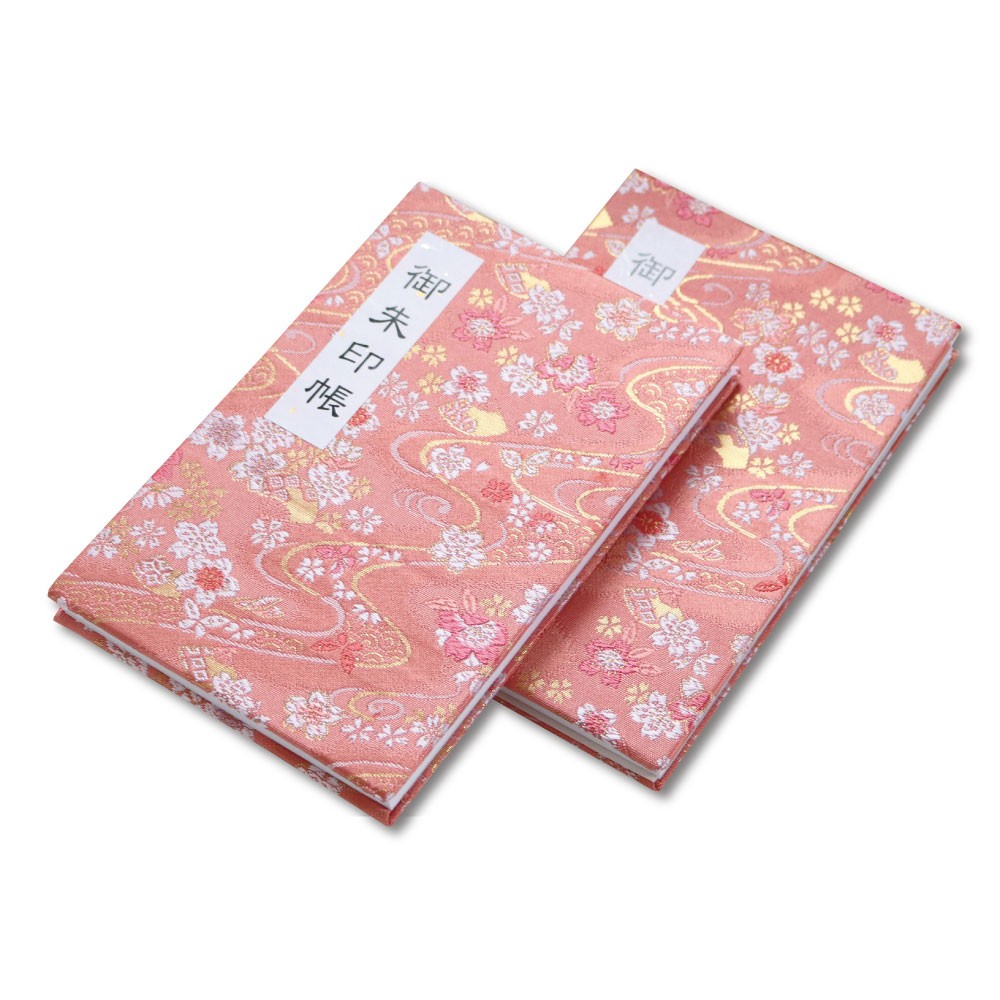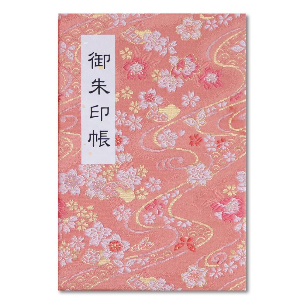 御朱印帳 大判 カバー付 蛇腹式 46ページ 西陣織 金襴 流水小花 薄紅色