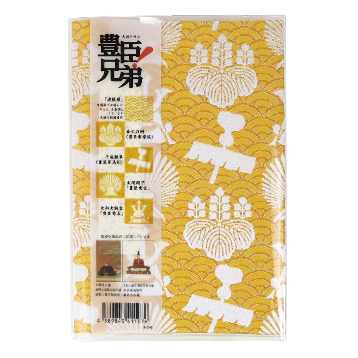 ・表紙は戦国時代の荒波や水の都大阪をイメージした波模様に豊臣家の家紋等の関連したモチーフが織られた生地で装丁されています。