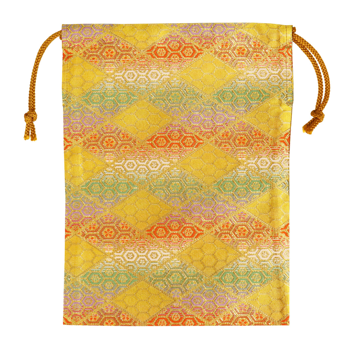 ・黄色地に金色の糸を使った金襴生地で製作された巾着袋です。