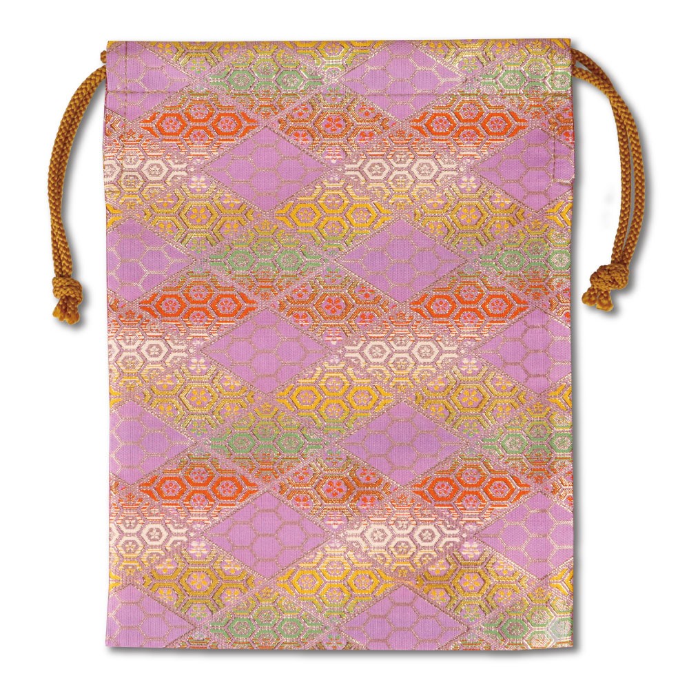 ・薄紫色の生地に金色の糸を使った金襴生地で製作された巾着袋です。