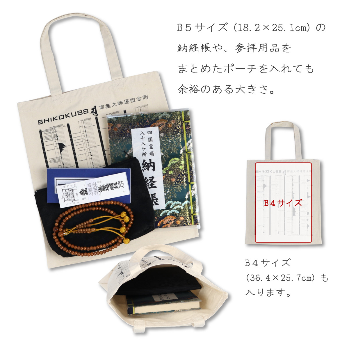 ・B4サイズ(36.4×25.7cm)が入る大きさで、納経帳や巡拝用品を入れても十分余裕があります。