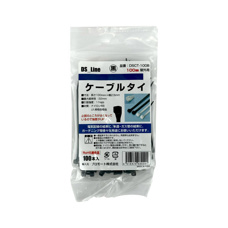 ケーブルタイ 100mm 結束バンド 100本入 ブラック 黒 屋外用 電気配線・水道・ガス管等に PROMOTE DSCT-100B