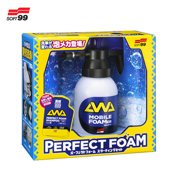 “泡”を追求した、新感覚のカーシャンプーセット。豊かな泡と高い洗浄力を発揮する「パーフェクトフォームシャンプーtypeS」を専用の加圧式噴射器「モビルフォーマー」にセットしスプレーすることで、自分で手軽にプロが使うような、ボディへのクッション性に優れたきめ細かく濃密な泡を実現。