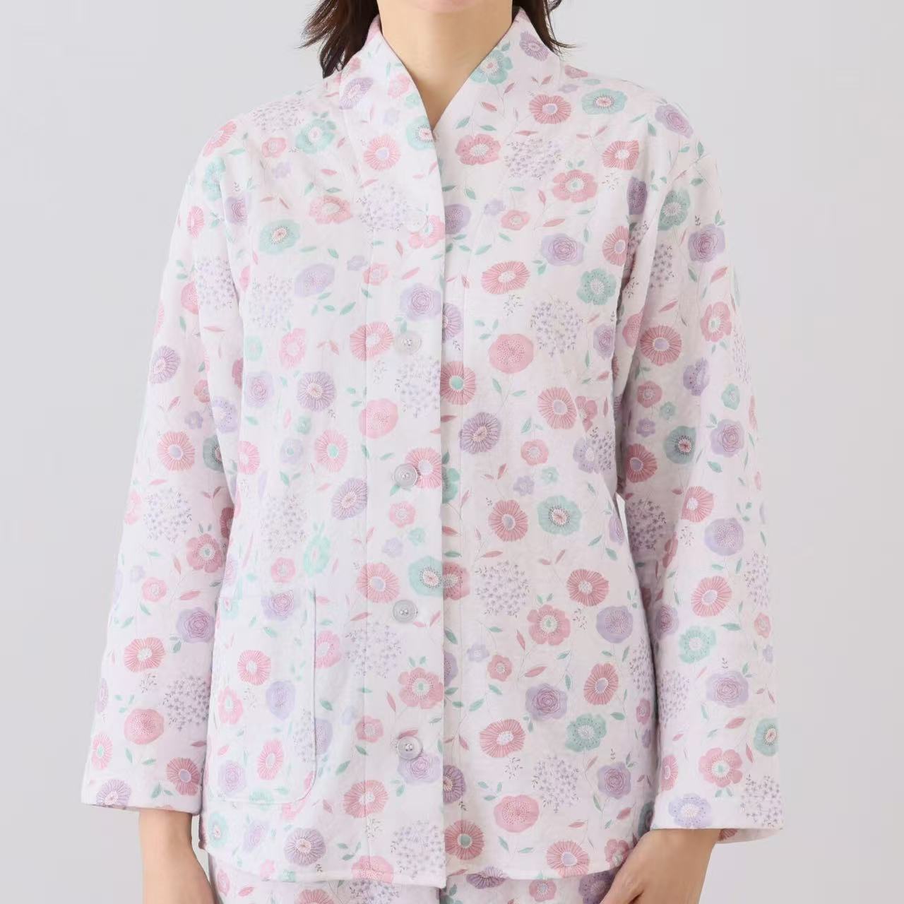 1946年創業 京都の老舗寝具メーカー<ロマンス小杉>より、モイスチャーコットン(熟成綿)から紡績したふんわりやわらかな糸を用いた、キルトニットパジャマです。