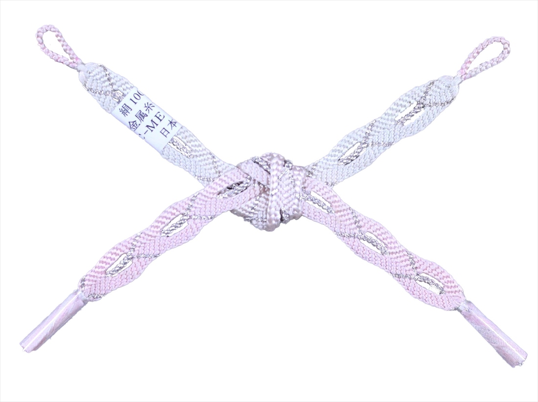 羽織り紐(ひも)・女性用・絹100%・金属糸使用・日本製・全長18cm・紐の太さ約1cm・地色はオフホワイト地にうすいピンク地です。