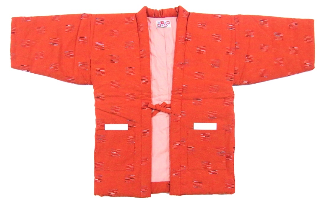 着丈(きたけ・肩からスソまでの長さ)82cm・裄(ゆき・背中心から袖口までの長さ)71cm・袖付け(そでつけ・肩山から脇までの長さ)33cm・胴囲130cm・重さ900g・表裏…綿100%・中わた…綿80%・ポリエステル20%・福岡県久留米カスリ・刺し子・ポケット1個付き・日本製・手軽でおしゃれな普段着の部屋着として人気があります。地色は濃いオレンジ地です。