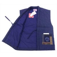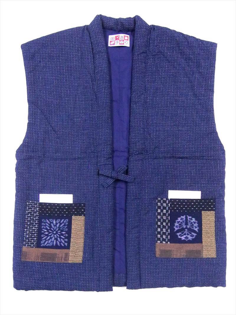 男性用袖なし半天(ちゃんちゃんこ ベスト ポンチョ)・表裏…綿100%・中わた…綿80%ポリエステル20%・着丈(きたけ・背中心からスソまでの長さ)82cm・身巾(みはば・胴廻り)130cm・裄(ゆき・背中心から肩口までの長さ)29cm・重さ580g・変わり織り(拡大写真参照)・福岡県久留米絣・ポケット2個付き・日本製・手軽でおしゃれな普段着の部屋着として人気があります。