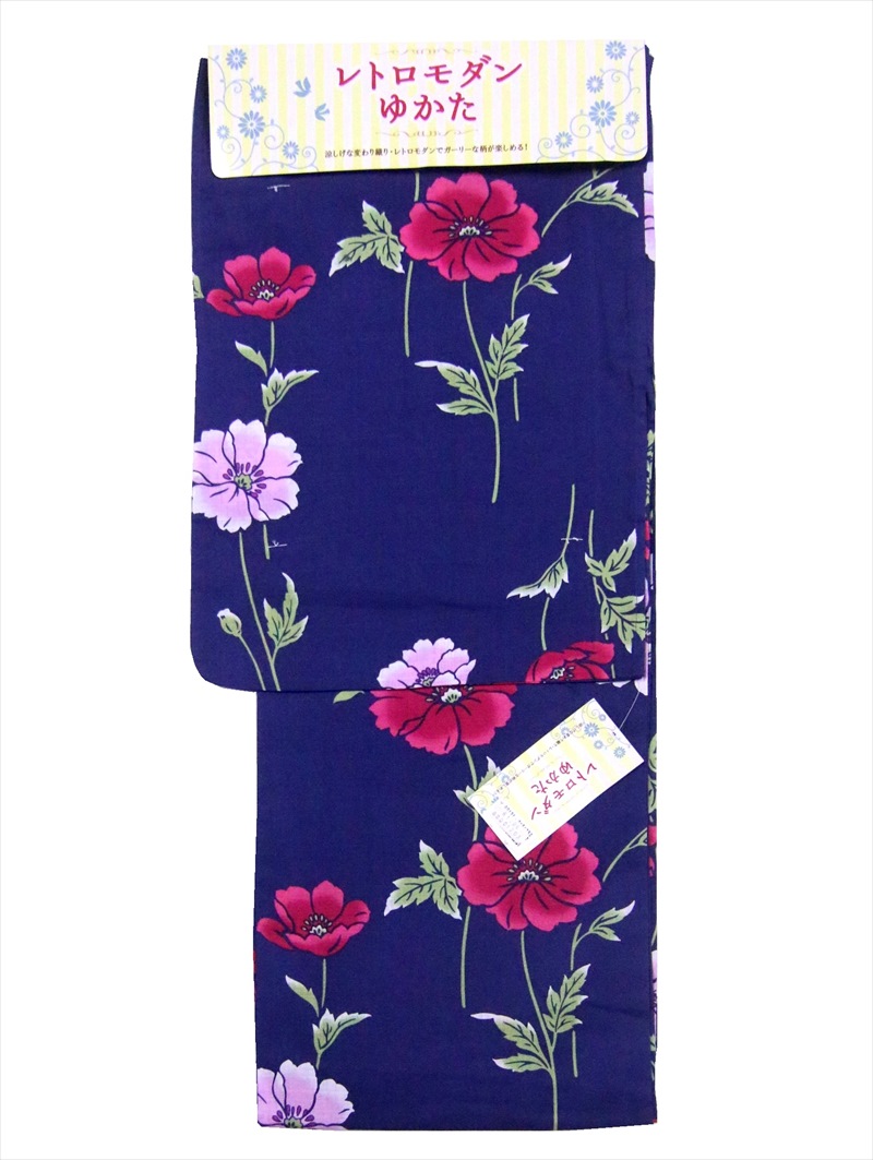 浴衣 フリーサイズ No.127 ヒナゲシ柄・紺地・レトロモダン