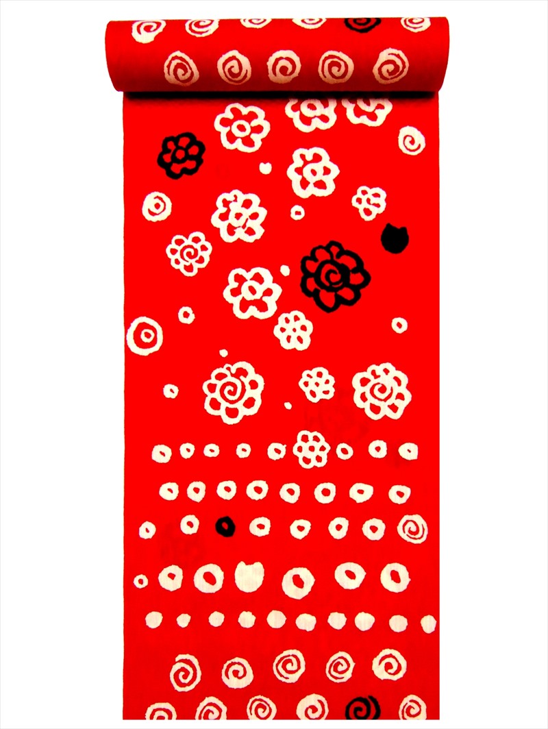 ツモリチサト・tsumori chisato・浴衣・反物・未仕立て品・長さ12m・巾39cm(クインサイズ)・綿100%・変り織り(拡大写真参照)・注染(手染め・両面染め)・耳有り・日本製。浴衣・甚平・洋装・のれん・インテリア・各種カバー類・民芸品など手芸の材料にご利用下さい。地色は赤地です。注染の浴衣はにじみを利用した独特の染色でありますので、多少の染めムラはご容赦ください。