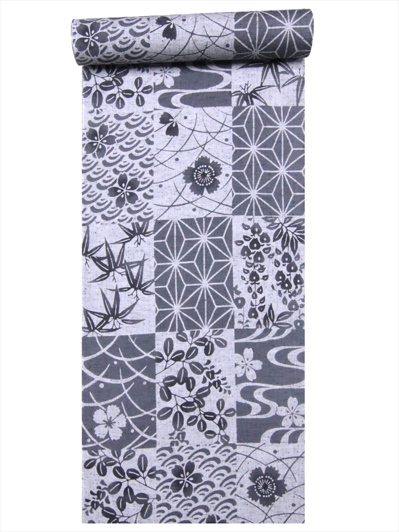 浴衣 反物 No.20 グレー地・市松・和柄・注染染め/耳あり