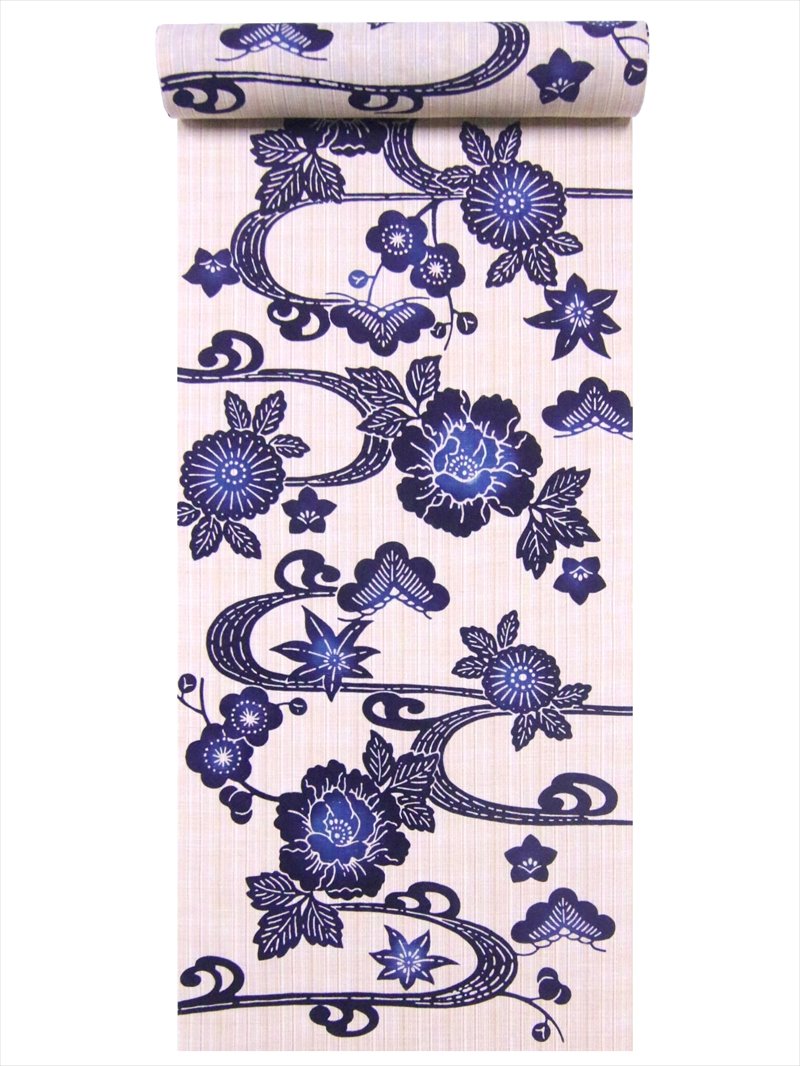 浴衣 反物 No.323 ベージュ地・牡丹柄・注染染め/耳あり