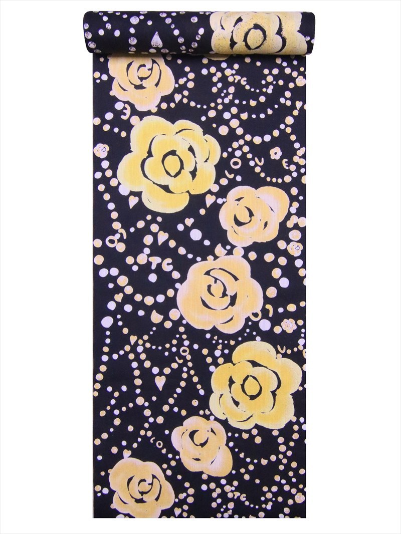 ツモリチサト・浴衣・反物・未仕立て品・綿100%・長さ12m・巾39cm(クインサイズ)・変り織り(拡大写真参照)・捺染(なっせん・片面染め・金彩加工)・耳有り・日本製。浴衣・甚平・洋装・のれん・インテリア・各種カバー類・民芸品など手芸の材料にご利用下さい。地色は黒地です。注染の浴衣はにじみを利用した独特の染色でありますので、多少の染めムラはご容赦ください。お手元に届きまして、イメージと違うようでしたら、裁断される前に至急ご返送ください。