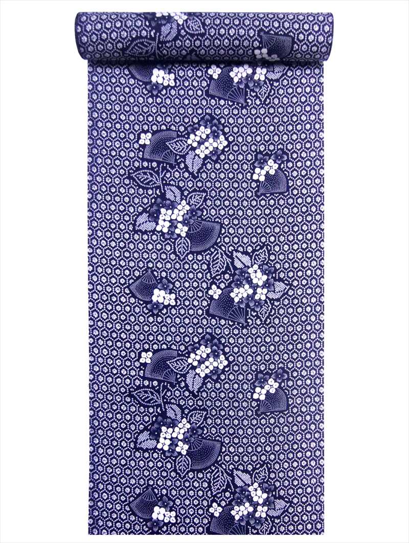浴衣・反物・未仕立て品・綿100%・長さ12m・巾40cm(クインサイズ)・捺染(片面染め)・平織り・耳あり・日本製。浴衣・洋装・のれん・インテリア・和雑貨・各種カバー類など手芸の材料にご利用下さい。地色は濃紺地に白です。お手元に届きまして、イメージと違うようでしたら、裁断される前に至急ご返送ください。