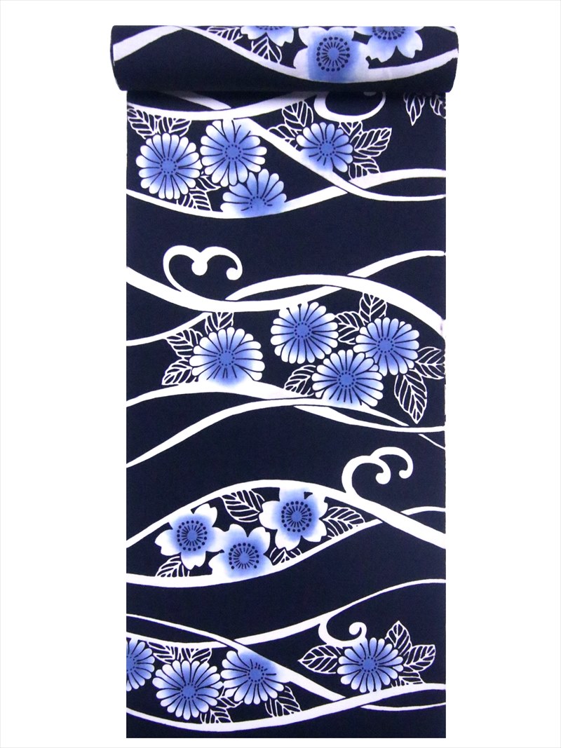 浴衣 反物 No.351 黒地・菊・波柄・注染染め/耳あり