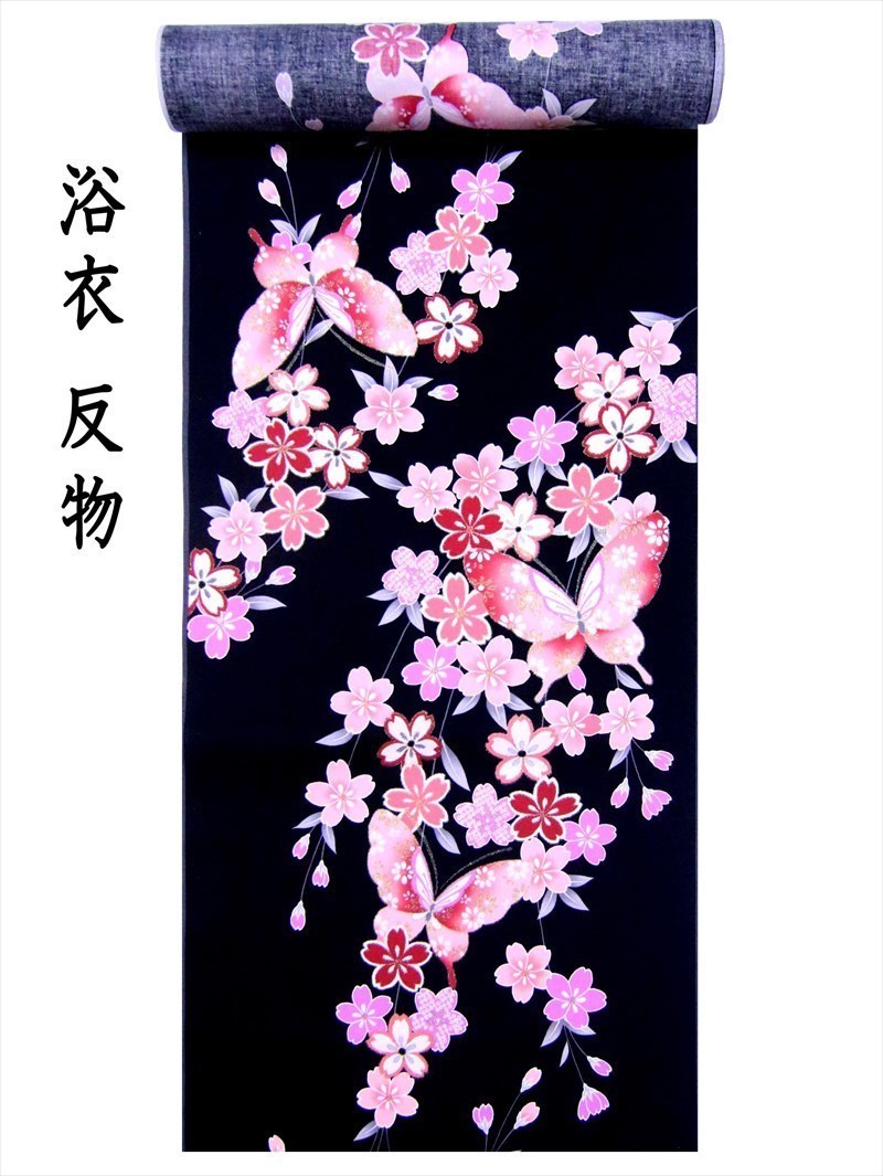浴衣 反物 No.437 トールサイズ 1反12m+別生地3m 黒地 チョウ柄 片面染め/耳ナシ