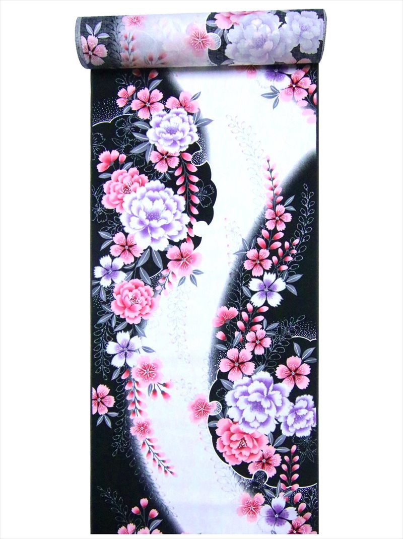 浴衣 反物 No.440 トールサイズ 1反12m+別生地3m 黒地 牡丹・雪輪柄 片面染め/耳ナシ