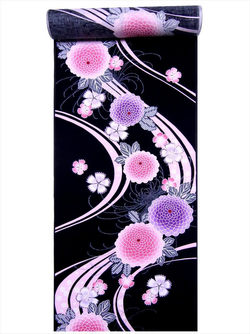 浴衣 反物 No.442 トールサイズ 1反12m+別生地3m 黒地 菊柄 片面染め/耳ナシ