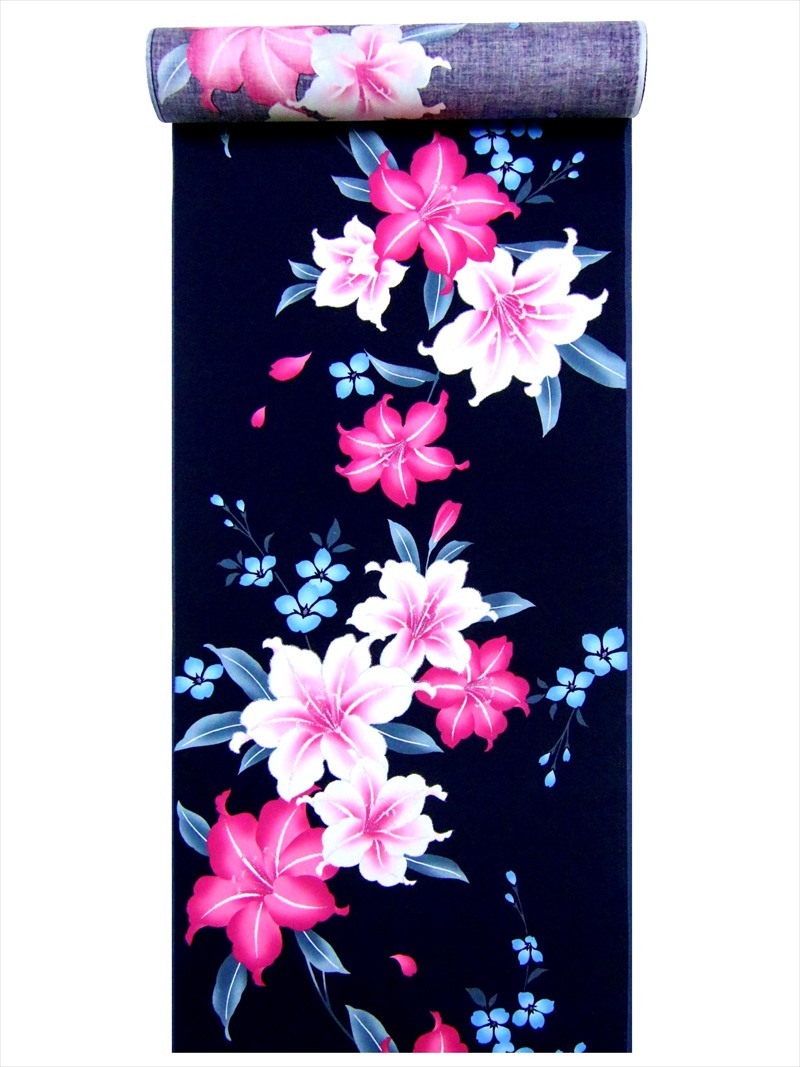 浴衣 反物 No.444 トールサイズ 1反12m+別生地3m 濃紺地 ユリ柄 片面染め/耳ナシ