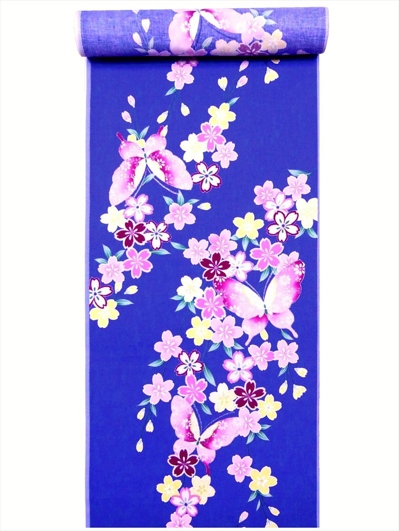 浴衣 反物 No.449 トールサイズ 1反12m+別生地3m ブルー地 チョウ柄 片面染め/耳ナシ