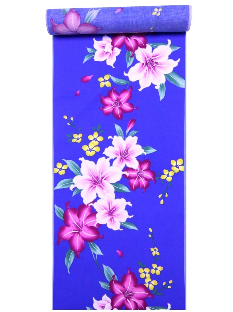 浴衣 反物 No.450 トールサイズ 1反12m+別生地3m ブルー地 ユリ柄 片面染め/耳ナシ