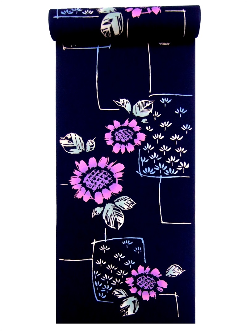 浴衣反物 NO.264 黒地・ヒマワリ柄・注染染め/耳あり