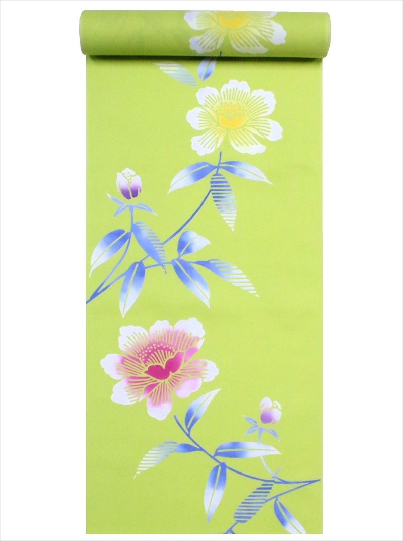 浴衣 反物 NO.266 若草色・ツツジ柄・注染染め/耳あり