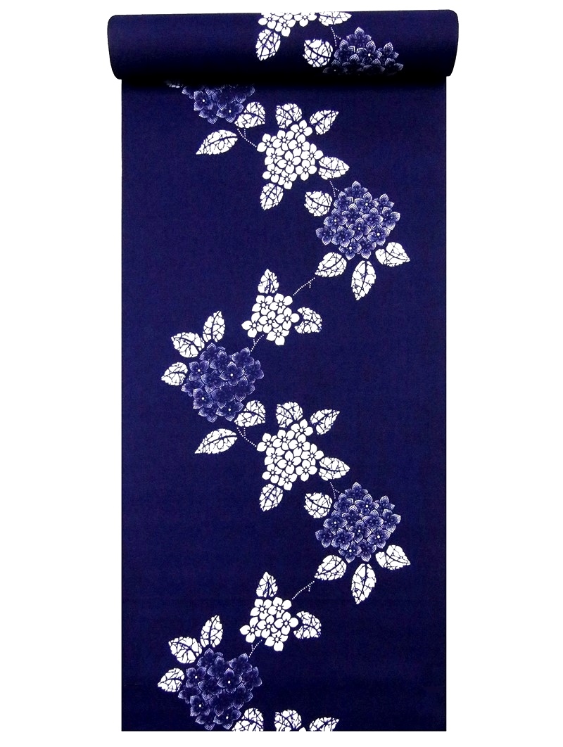 浴衣 反物 No.75 濃紺地 アジサイ柄 耳有り