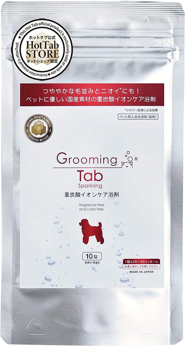 グルーミングタブは、ホットタブの製造ノウハウをもとに開発した「ペット専用入浴剤」です。表皮の厚さか?人間の三分の一ほと?しかなく、非常にテ?リケートな「弱アルカリ性の皮膚」を持つ犬・猫用の中性pH、無香料、無着色、無添加の入浴剤て?す。