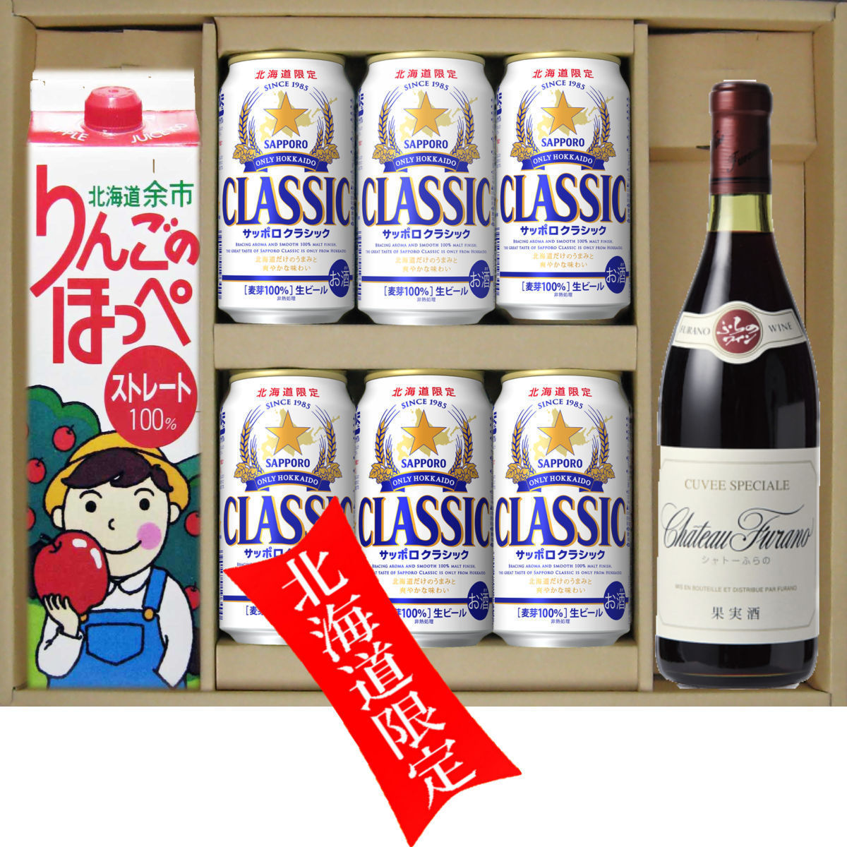 お歳暮 御礼ギフト サッポロクラシック ビール 350缶 6本 余市 リンゴのほっぺ 1000ml 1本 ふらのワイン シャトーふらの 赤 720ml 1本