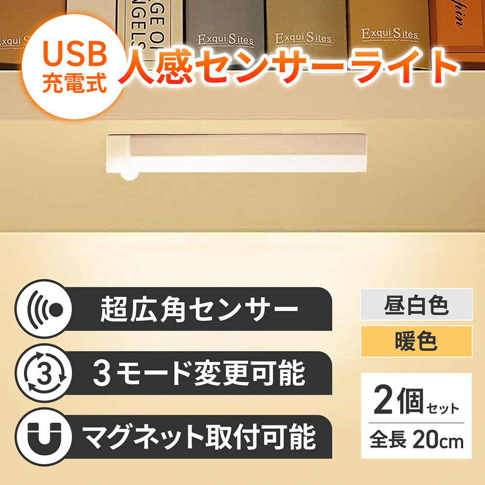 センサーライト 人感センサーライト 室内 充電式 2個セット 2本セット LEDライト 玄関 廊下 トイレ USB マグネット 足元灯