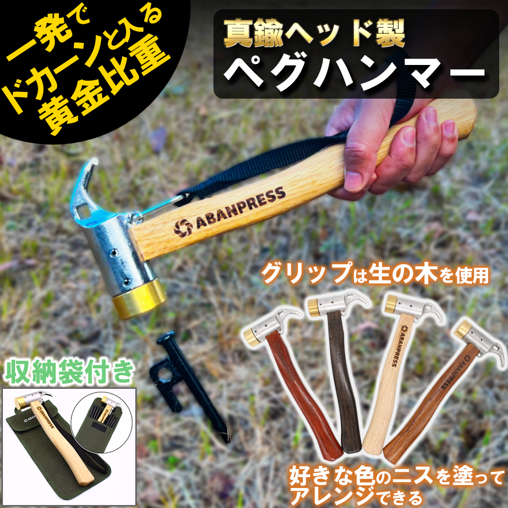 ・【生木グリップ】グリップにニスを塗る前の生の木をしています。そのため好きな色のニスを塗ることができ、オリジナルのペグハンマーを作ることができます。 バーナーで炙ることで、ヴィンテージ感を演出することもできます。さらに塗料でペイントすることでアンティーク風になり、独自のアレンジが楽しめます。