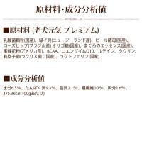 緑イ貝・ヒアルロン酸・蜜蜂花粉 ・ビール酵母 ・オメガ3・ローズヒップ ・乳酸菌などの老犬のコンディションをサポートする老犬元気にさらにコエンザイムQ10・タウリン・BCAA・ルテインをプラス!