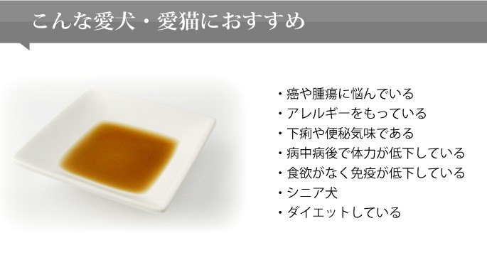 食品として体重10kgにつき1日5ml(1本の半分)を目安に毎回の食事に混ぜて与えてあげてください。(与えすぎても問題はありません。)