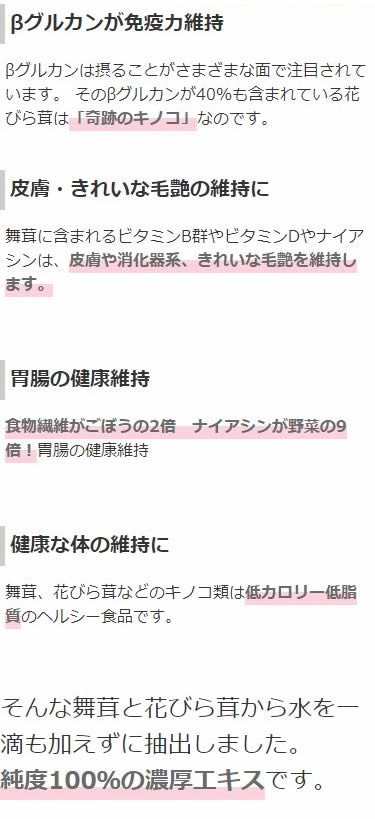 栄養豊富な舞茸と花びら茸エキスから水を一滴も加えず、茸のみから抽出した100%エキスです。